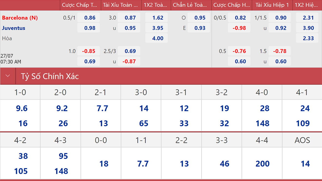 Soi kèo nhà cái Barcelona vs Juventus. Nhận định, dự đoán bóng đá Giao hữu CLB (07h30, 27/7). Dự đoán bóng đá Barcelona vs Juventus. Tỷ lệ kèo Giao hữu CLB.
