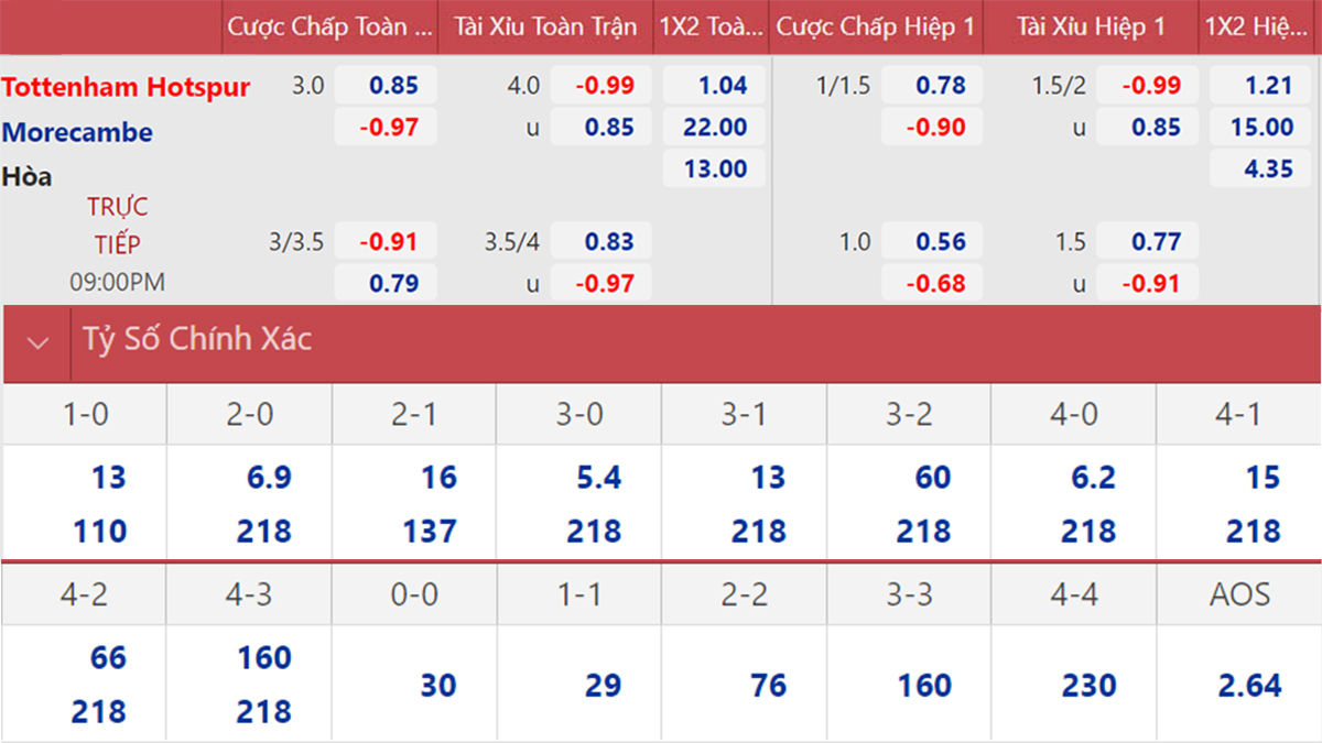 Tottenham nhiều khả năng giành chiến thắng và trận đấu này sẽ có nhiều bàn thắng. Morecambe đang đá ở giải hạng Nhì nên rất có thể sẽ nhận thất bại được đối thủ được đánh giá cao hơn họ rất nhiều là Tottenham.