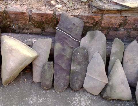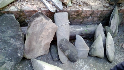 Những thanh đá với nhiều hình dạng khác nhau do ông Huyên phát hiện. Ảnh: Mạnh Thành - TTXVNTrong lúc đào ao thả cá, ông Phạm Đình Huyên ở xã Cự Nẫm, huyện Bố Trạch, tỉnh Quảng Bình bất ngờ phát hiện 20 thanh đá với nhiều hình dạng khác nhau nằm sâu dưới mặt đất hơn 2 mét. Thấy lạ nên ông Huyên đã dùng búa gõ vào từng phiến đá và thu được âm thanh vang rất xa với nhiều âm vực khác nhau.
