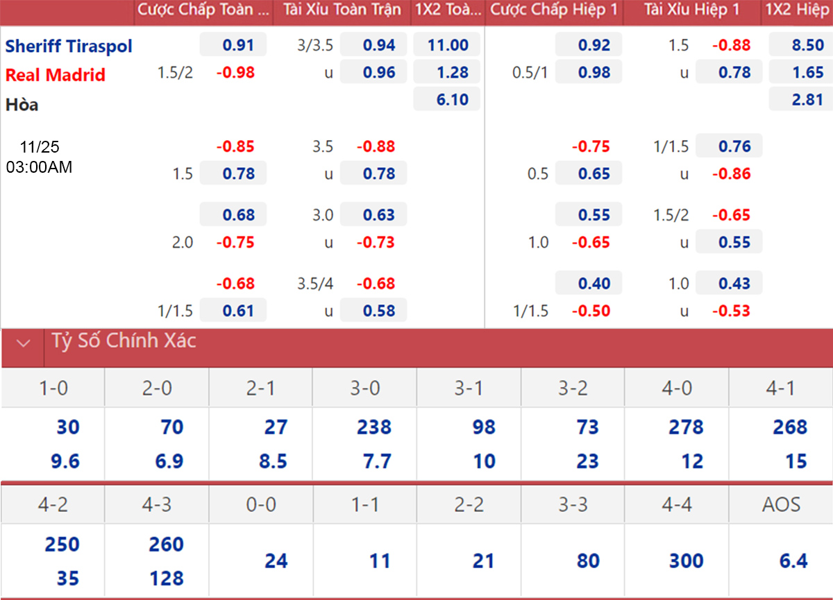 * 03h00, 25/11: Sheriff vs Real Madrid