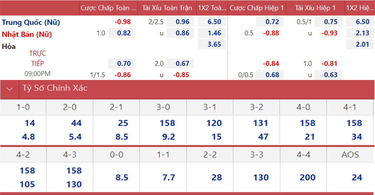 Nhật Bản đang có thành tích đối đầu khá tốt trước Trung Quốc thời gian gần đây nên họ vẫn được các nhà cái đánh giá nhỉnh hơn đôi chút. Một chiến thắng với cách biệt sít sao cho Nhật Bản là kịch bản dễ xảy ra ở trận bán kết sắp tới.