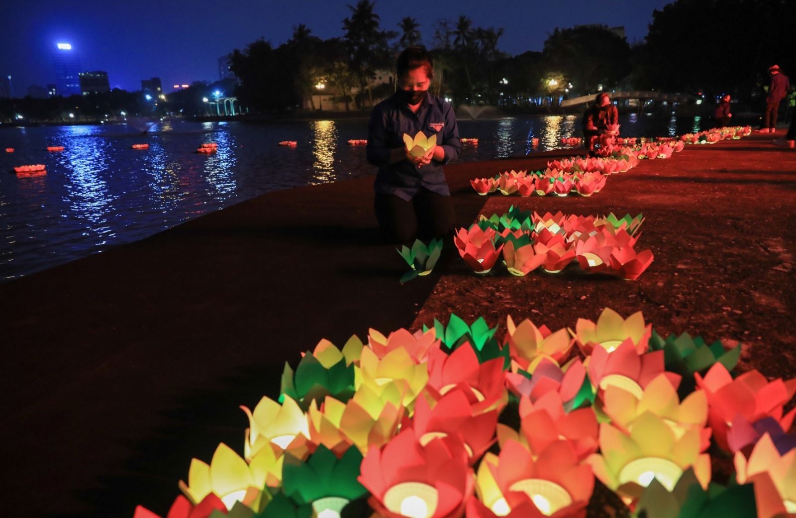 Những ngọn nến và đèn hoa đăng được thả trôi dưới mặt hồ công viên Thống Nhất (Hà Nội) để tưởng niệm đồng bào và cán bộ, chiến sĩ hy sinh, tử vong trong đại dịch COVID-19