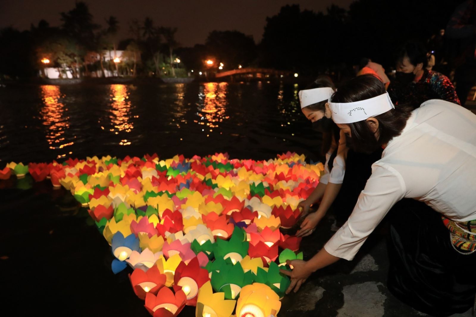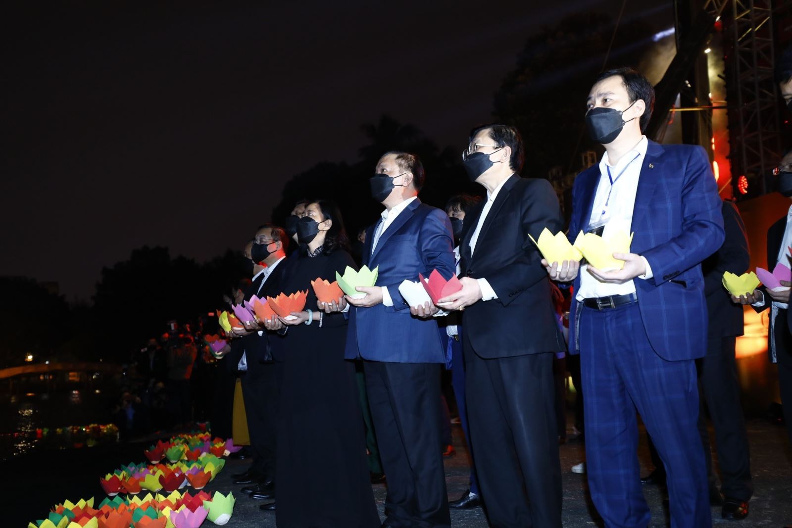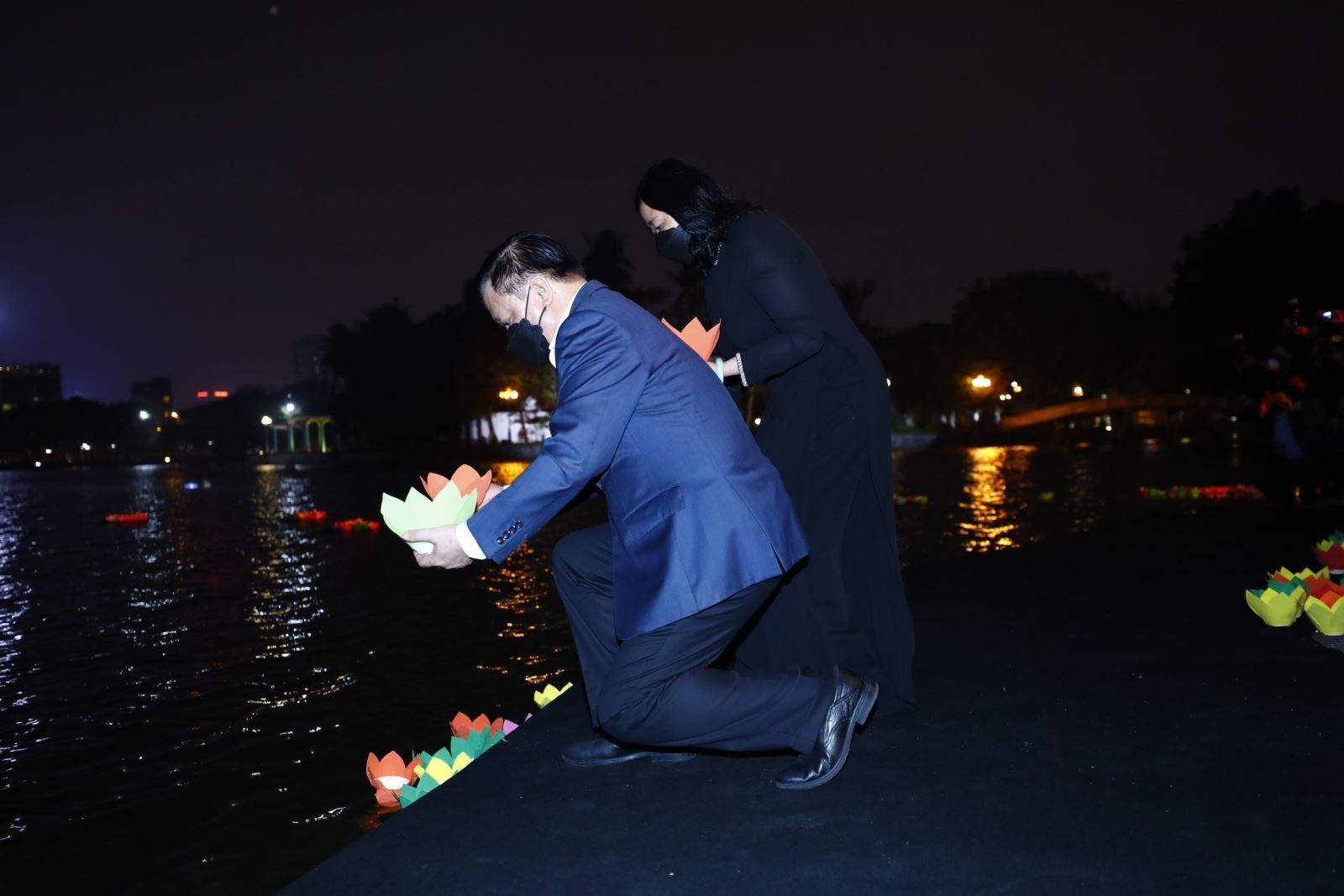 Ủy viên Bộ Chính trị, Bí thư Thành ủy Thành phố Hà Nội Đinh Tiến Dũng và Bí thư Trung ương Đảng, Trưởng Ban Dân vận Trung ương Bùi Thị Minh Hoài và các đại biểu thả hoa đăng tưởng niệm đồng bào và cán bộ, chiến sĩ hy sinh, tử vong trong đại dịch COVID-19.