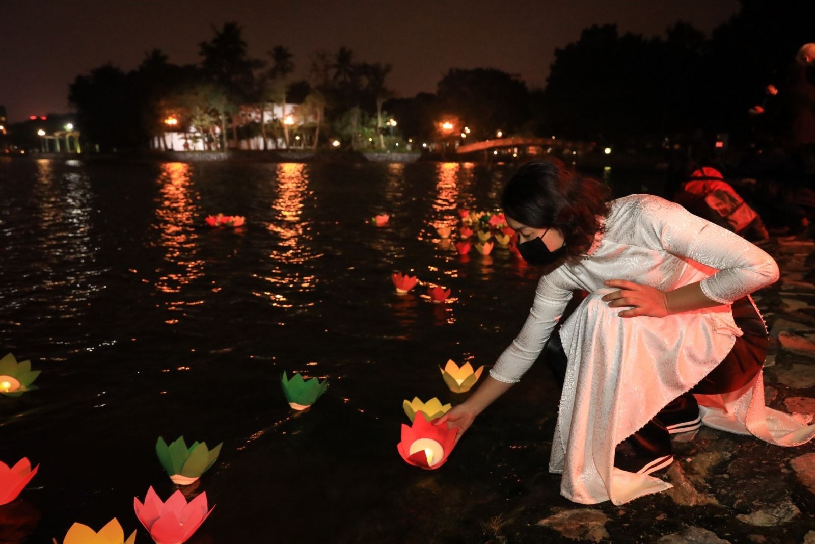 Các đại biểu và người dân thắp nến, thả đèn hoa đăng tưởng niệm đồng bào và cán bộ, chiến sĩ hy sinh, tử vong trong đại dịch COVID-19.