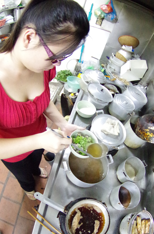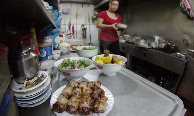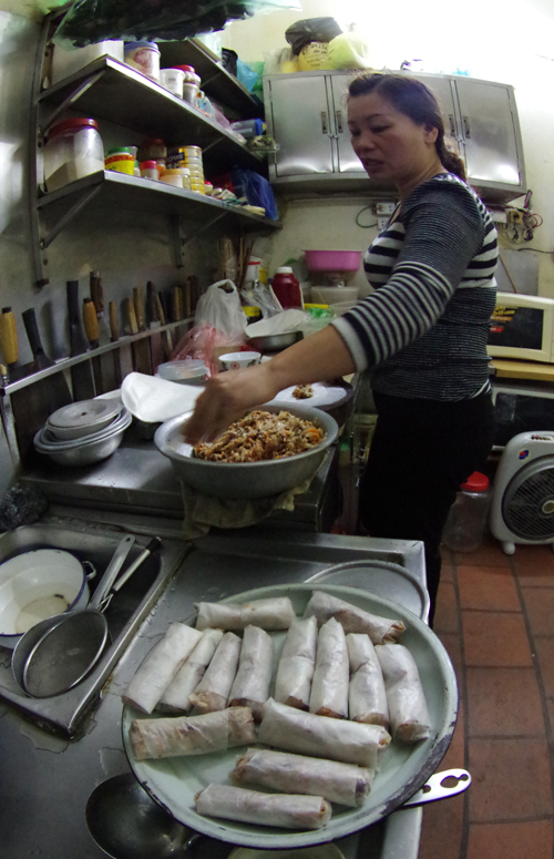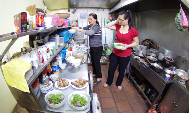 Tạm gác lại công việc chăm sóc cho nhà hàng Quảng An tại 22 Hàng Cân, cô con gái Nguyễn Thu Hằng cũng cùng mẹ vào bếp